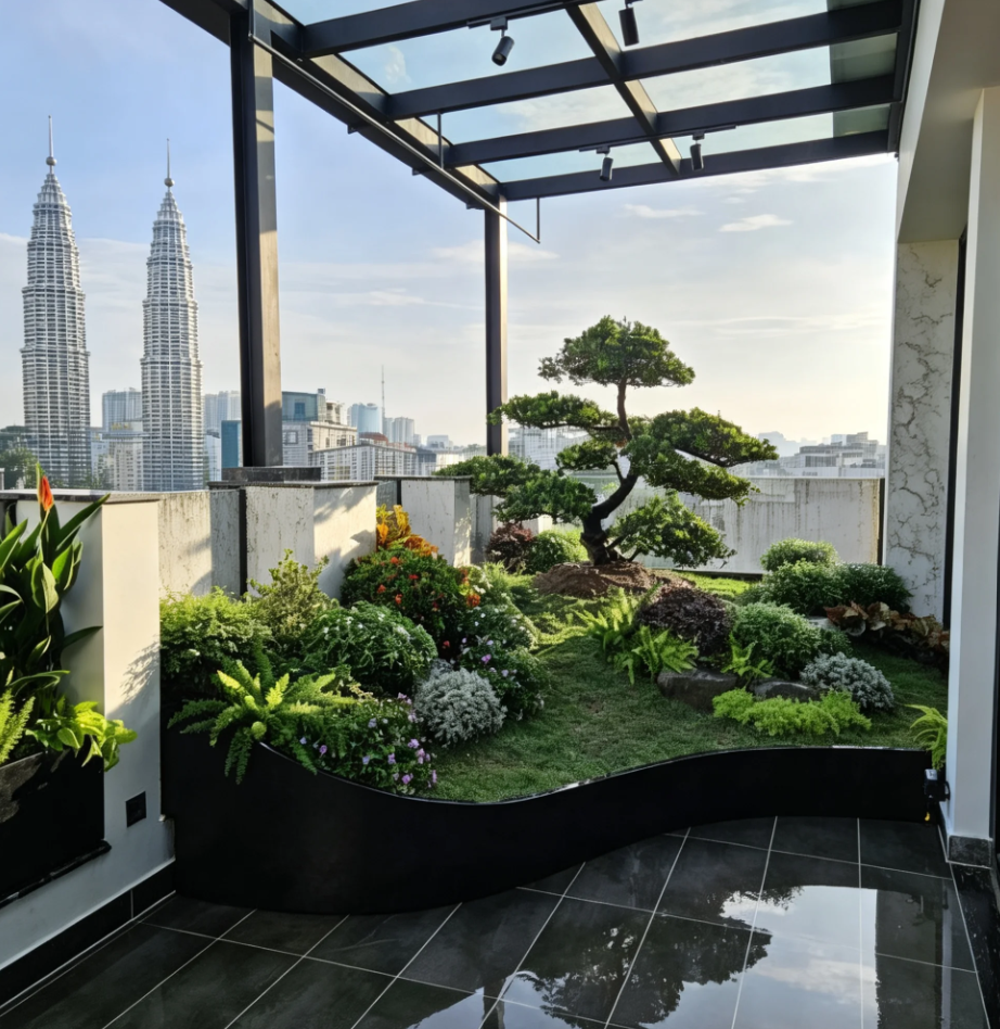 Garden landscape design services in Malaysia. We design and build beautiful outdoor spaces including tropical gardens, water features, plant arrangements, and modern landscape concepts for residential and commercial projects.