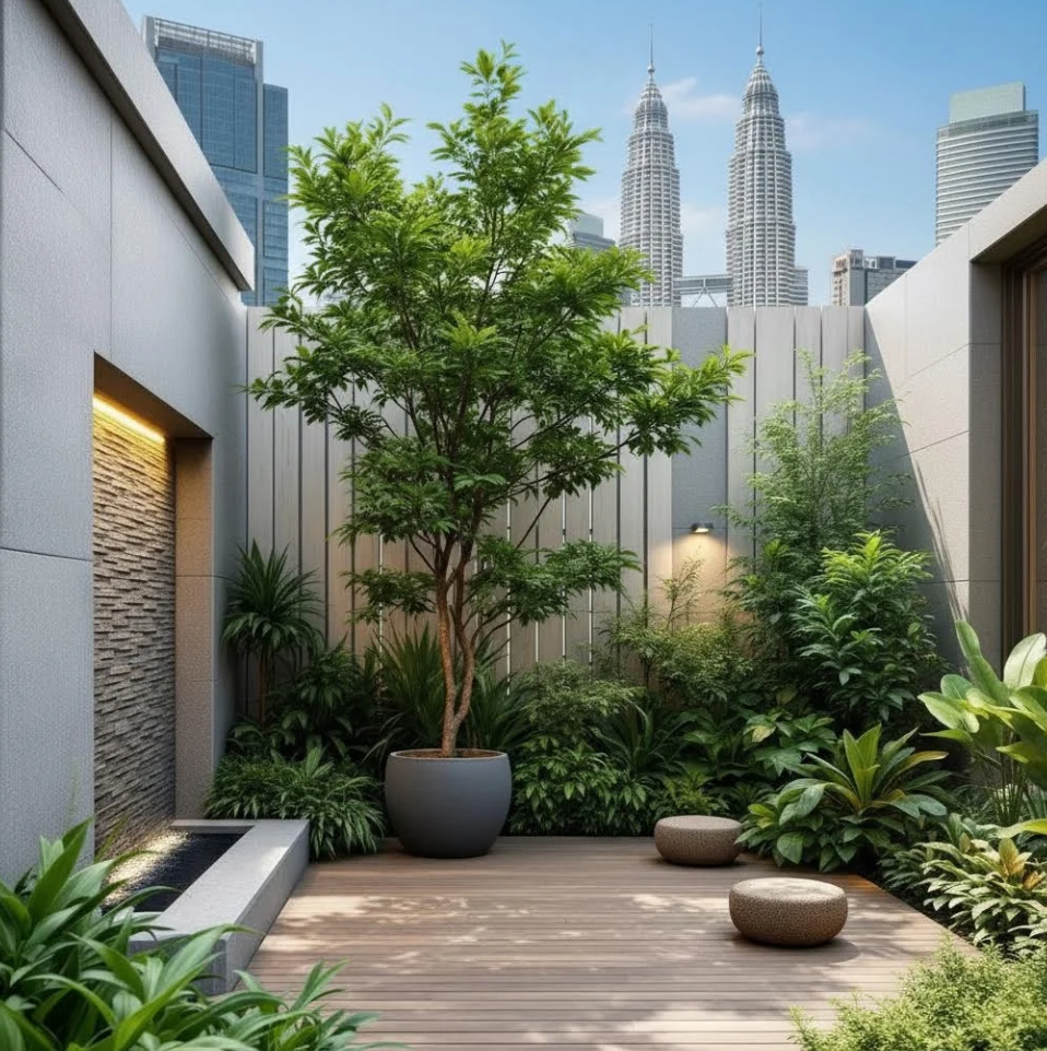 Garden landscape design services in Malaysia. We design and build beautiful outdoor spaces including tropical gardens, water features, plant arrangements, and modern landscape concepts for residential and commercial projects.